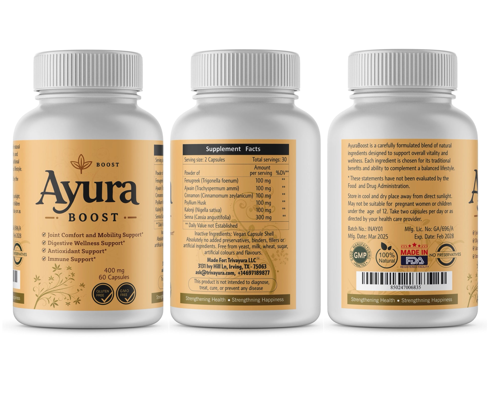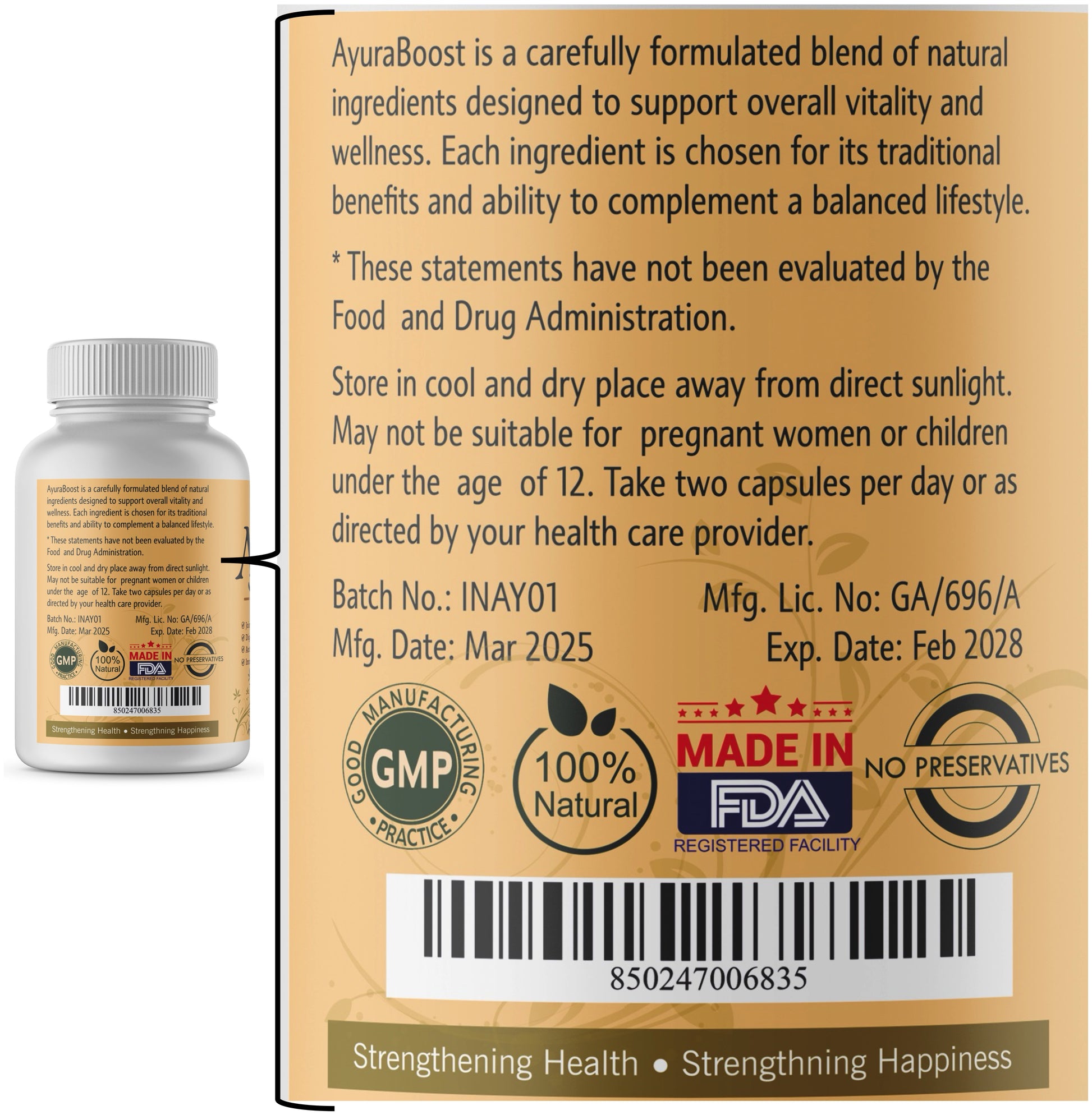 - AyuraBoost* is a carefully formulated blend of natural ingredients designed to support overall vitality and wellness.