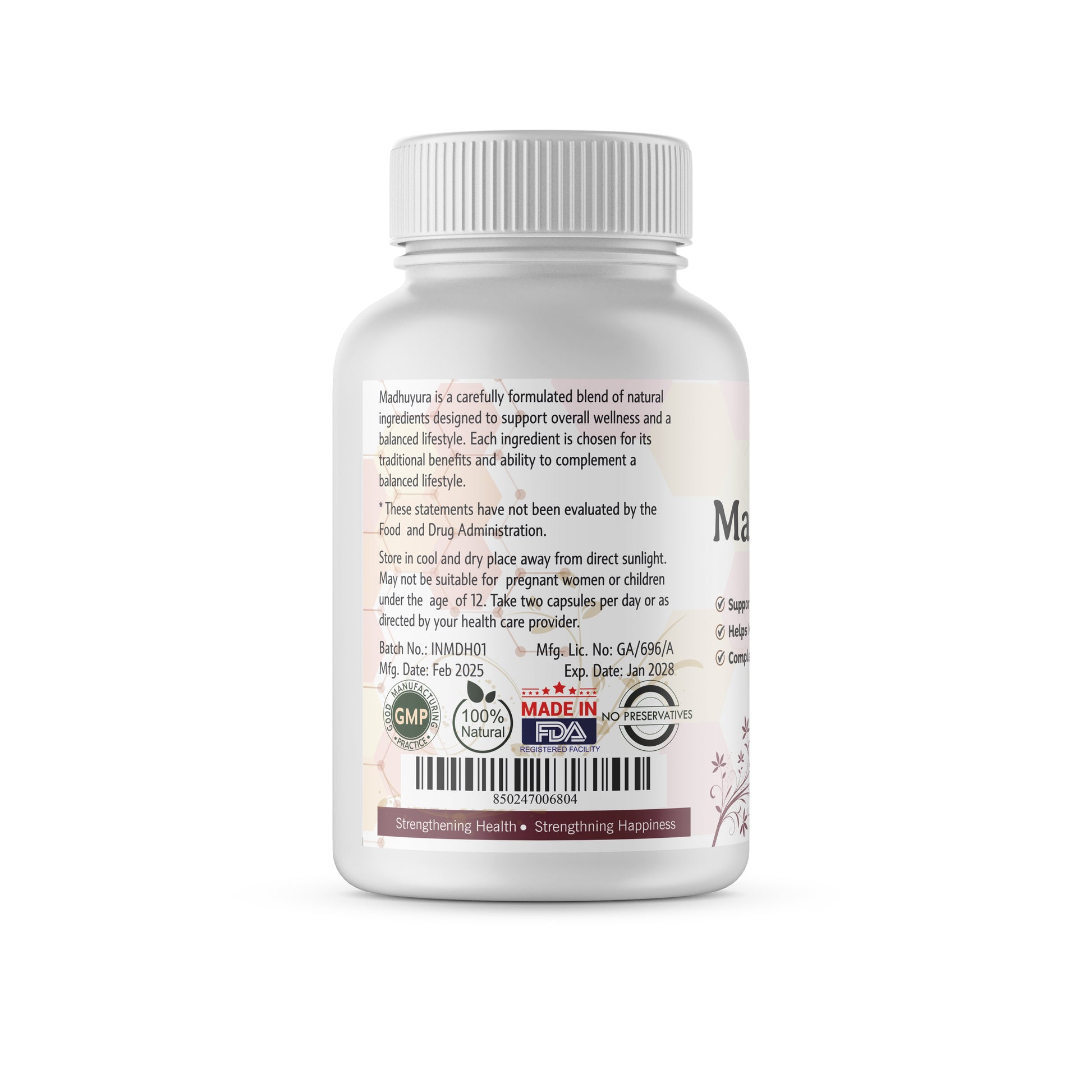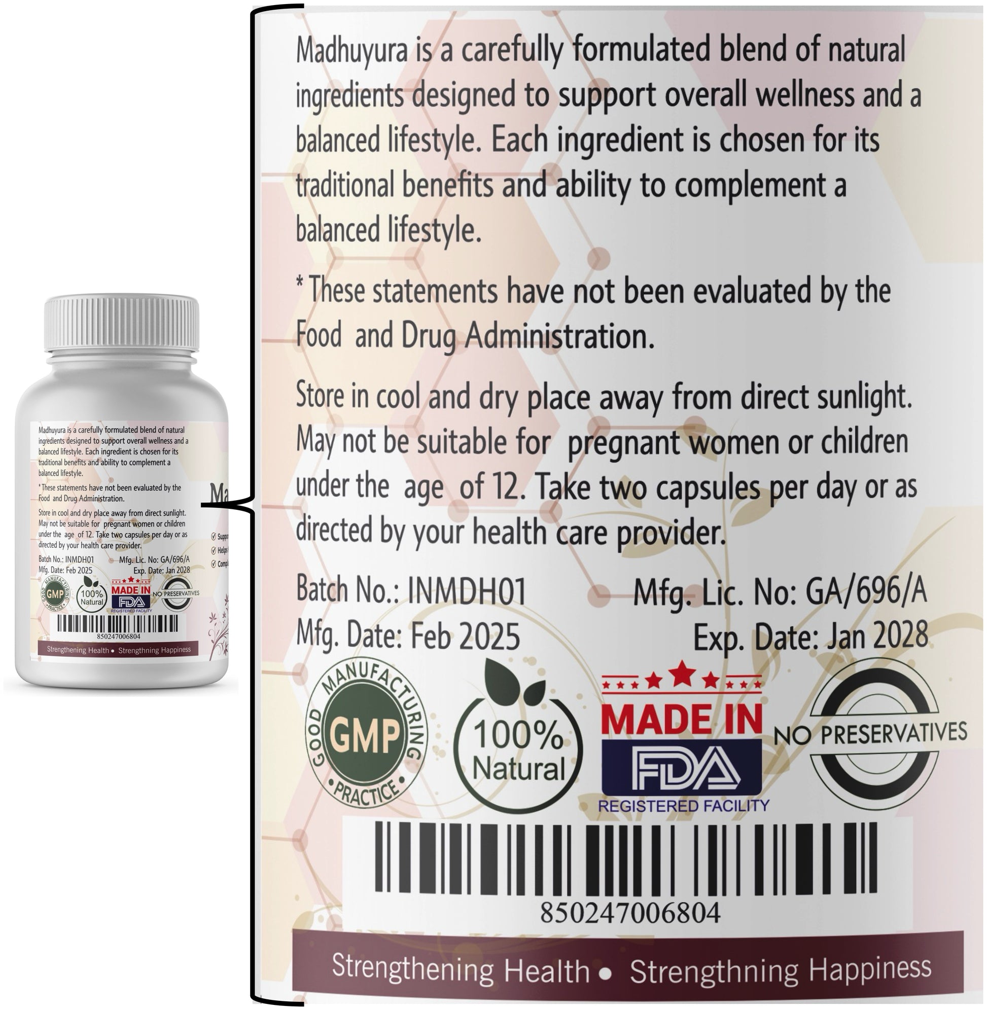 - Madhuyura* is a carefully formulated blend of natural ingredients designed to support overall wellness and a balanced lifestyle.