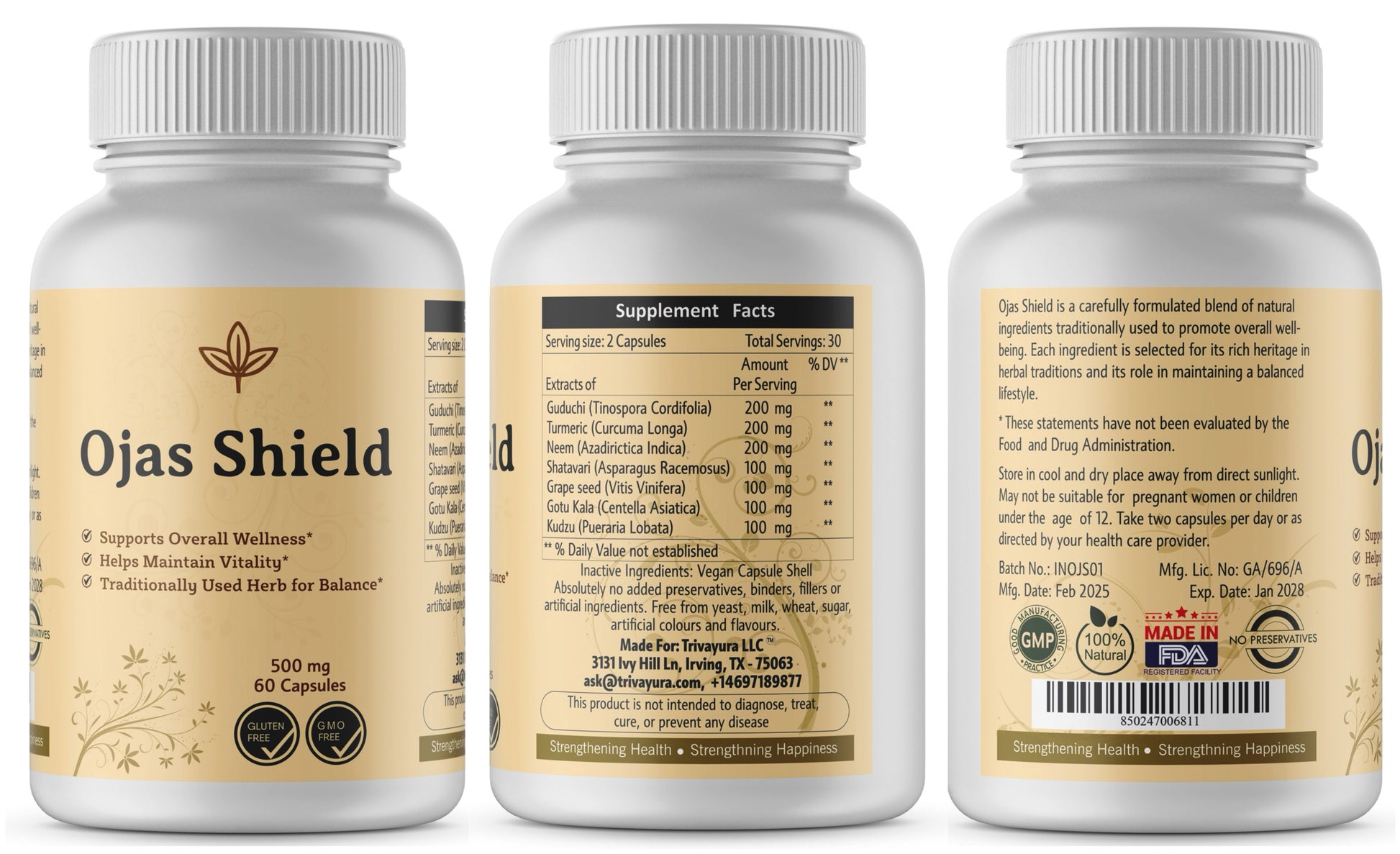 - Ojas Shield* is a carefully formulated blend of natural ingredients traditionally used to promote overall well-being. Each ingredient is selected for its rich heritage in herbal traditions and its role in maintaining a balanced lifestyle.